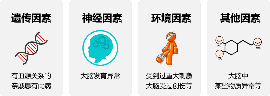 遺傳因素影響顯著,近親中有患者的個(gè)體,自身發(fā)病風(fēng)險(xiǎn)會(huì)明顯升高;神經(jīng)遞質(zhì)失衡(如多巴胺、血清素水平異常)、腦結(jié)構(gòu)改變(如海馬體體積縮小或增大)等,均與發(fā)病密切相關(guān)。